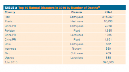 Almost 300 million people were affected by natural disasters in 2010. The large disasters provided constant headlines throughout the year, beginning with the devastating earthquake in Haiti fol-lowed one month later by the even more severe—but far less deadly—earthquake in Chile. In the spring, ash spewing from volcano Eyjafjallajökull in Iceland paralyzed flights for weeks in the north-ern hemisphere. Early summer witnessed the worst Russian wildfires in history while a few months later, the steadily rising floodwaters in Pakistan covered 20 percent of the country. In sum, it was a terrible year in terms of natural disasters causing havoc and destruction around the globe. However, many of the largest disasters barely made headlines in the Western press.