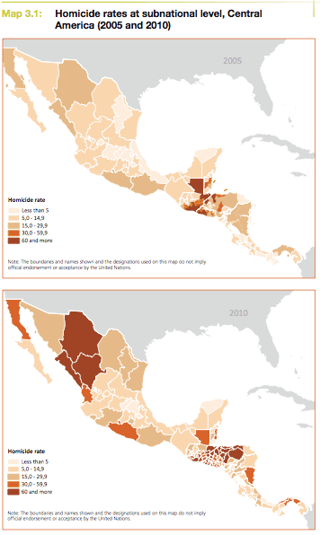 Maybe one of the more disturbing, though probably not surprising, findings was just how quickly homicide rates are shooting up in central America. The first map is from 2005. The second 2010.