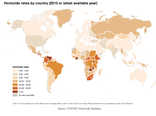 Those figures come from an exhaustive new study on global homicides compiled by the UN Office on Drugs and Crimes, which also published this map.